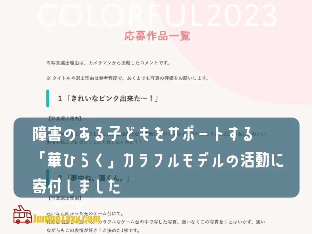 ジャンボタクシー.comを運営をする埼玉県さいたま市桜区の株式会社 平和観光は「華ひらく」様のカラフルモデル(障害のあるキッズモデル)の活動へ微力ながらも、寄付を通じて支援させていただきました。障害があっても堂々と生きられる社会を目指す彼らの... -