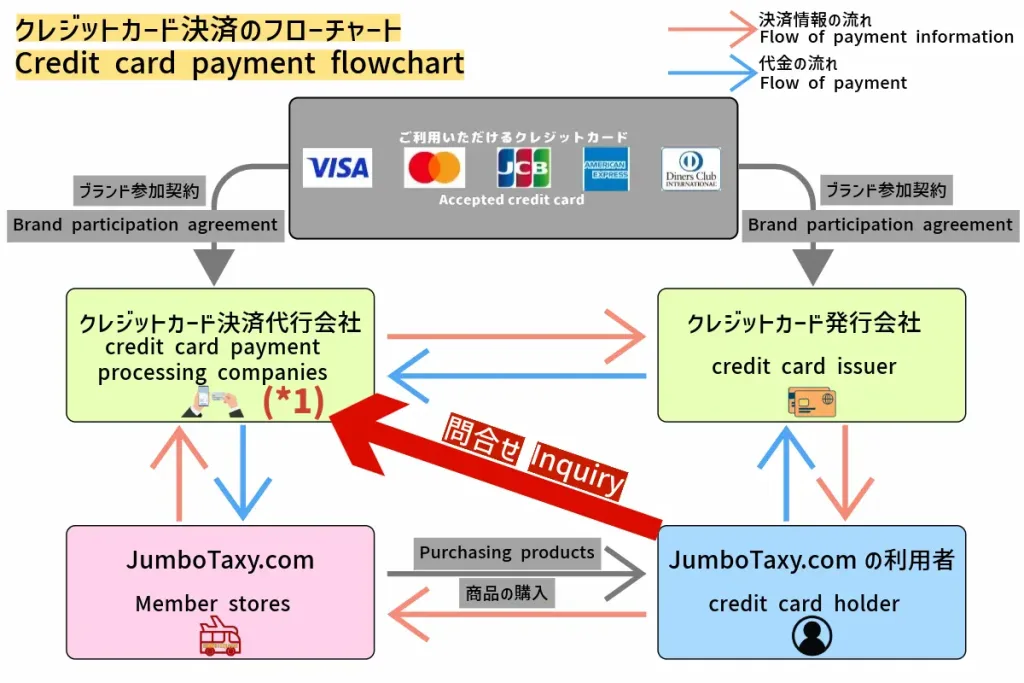 - JumboTaxy.com uses both Japanese and overseas credit card payment processing companies, depending on the brand. This is for the convenience of our users, as JumboTaxy.com has many users not only in Japan but also outside of Japan.