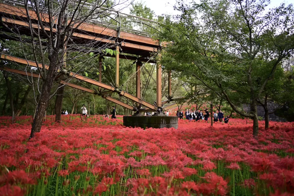 10月上旬、埼玉県日高市の巾着田では、真っ赤な曼珠沙華(彼岸花)が見ごろを迎えていました。 埼玉県日高市・巾着田に広がる曼珠沙華の群生。赤い花々が秋空の下で輝く、季節限定の美しい風景。 赤い曼珠沙華に囲まれた木道を歩く人々。秋の穏やかな陽射...